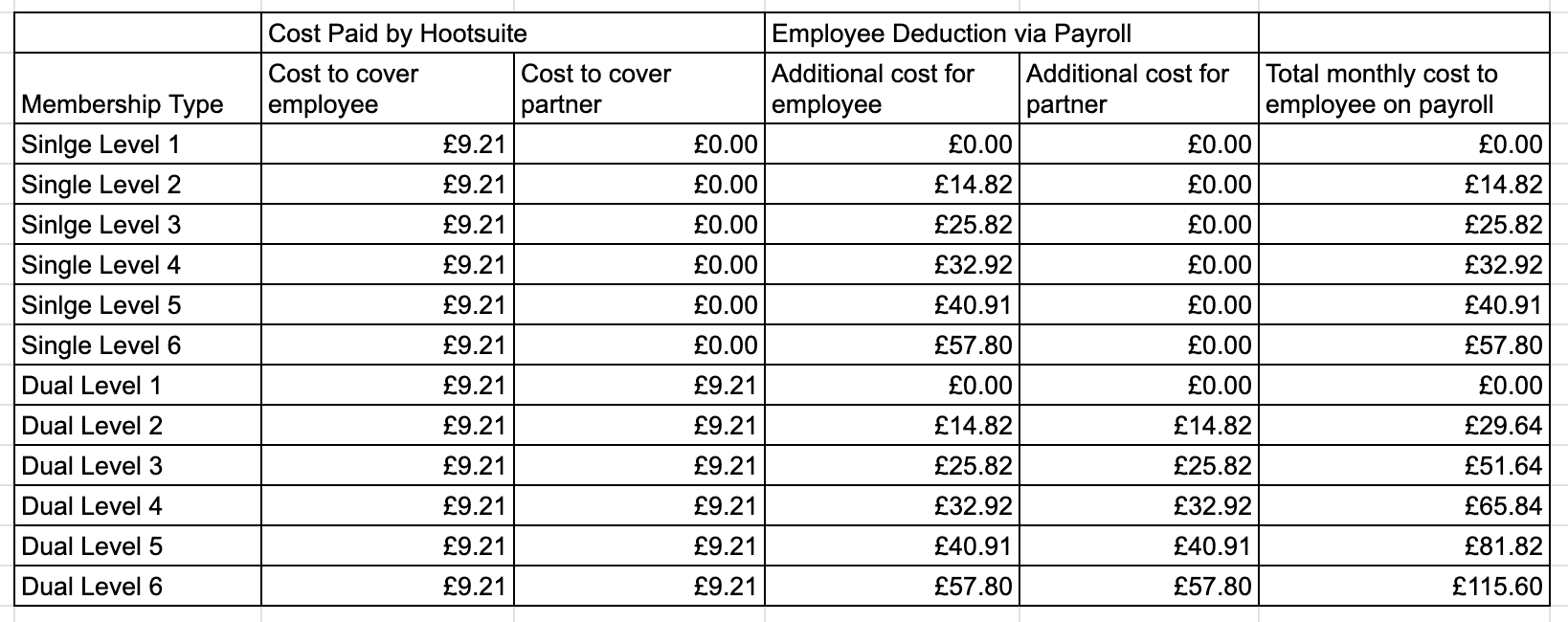 If employees wish to enhance their coverage, they can choose to upgrade to a higher level-up to Level 6 - at their own cost via payroll. Below you will find the rate table for increasing cover for yourself and your partner if you wish. You can find the overview of cover under the different levels here.